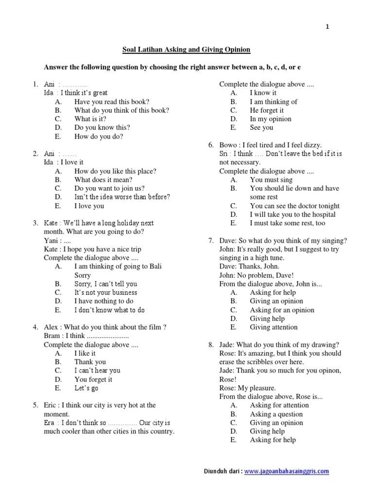 Make a short dialogue with expressions of giving opinion; Contoh percakapan bahasa inggris tentang opinion; Berikut ini contoh dialog dengan menggunakan kalimat meminta dan memberi . Contoh dialog asking for opinion . Contoh dialog asking and giving opinion bahasa inggris, dialog formal, dialog informal, dialog tentang corona, dialog tentang bullying baik .